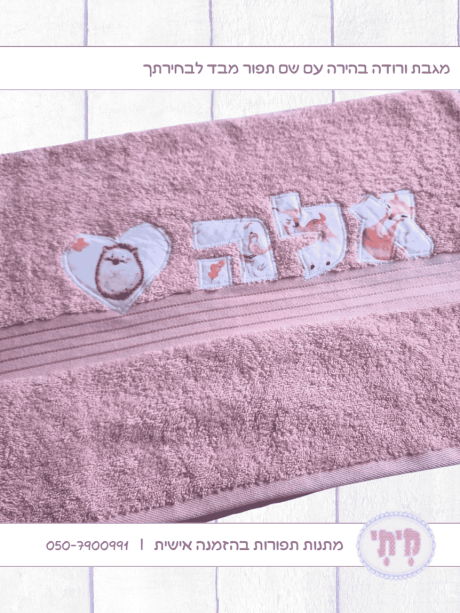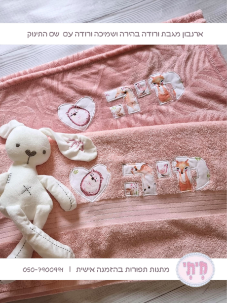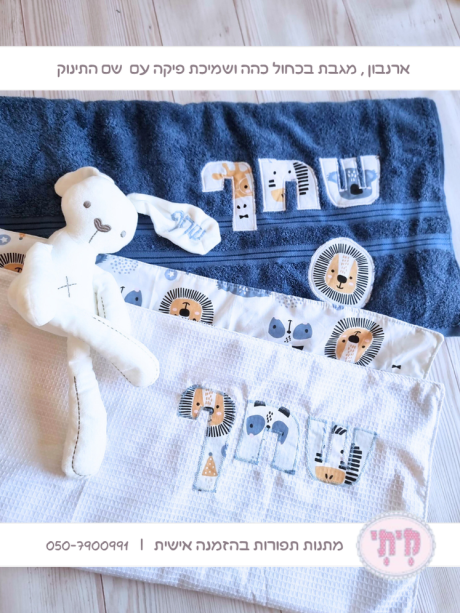 מתנת לידה אשר תשמש ותרגש למשך שנים רבות . שמיכת כרבולית במידות 1.3 על 1.6 מ'. מגבת רחצה במידות 130 על 70 ס"מ. ובובת ארנבון מתוק. כולם עם שם התינוק .